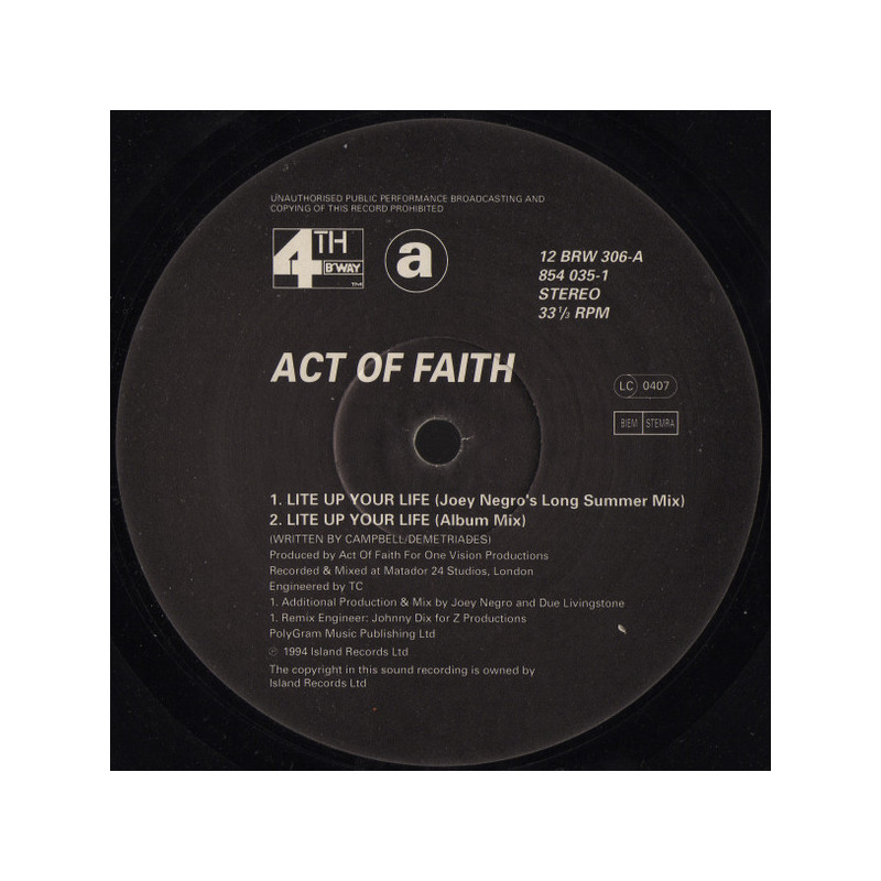 Act Of Faith - Lite Up Your Life | Vinyl | 1994 | 4th & Broadway | Early Dave Lee Soul Funk Mixes